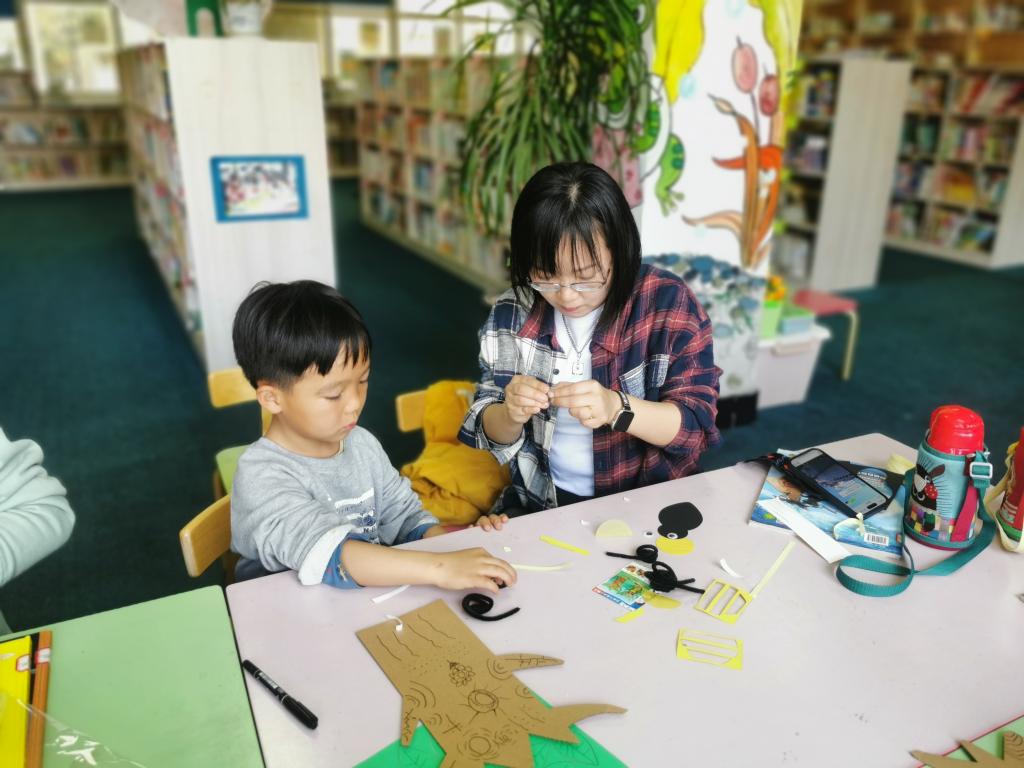 参观结束,行知书苑老师给小读者们带来一节充满无限创意和活力的手工制作课——《大树与昆虫小精灵》。老师精心准备了手工制作材料,并给小读者们介绍了《大叔与昆虫小精灵》制作步骤及方法。紧接着,小读者们纷纷动起手来,拿出树干、画出枝条、粘上树叶、再钉上瓢虫……一棵棵大树,一片片树叶,一只只七星瓢虫,在孩子们的手中摇身一变,变成了形态各异的大树和小精灵。小读者们在手工制作中与大自然来了次亲密接触,让绿色在手工中绽放!